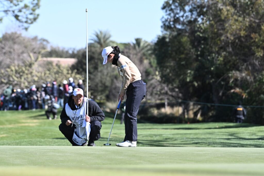 Youmin Hwang's caddie was either reading the green or looking for warmth.